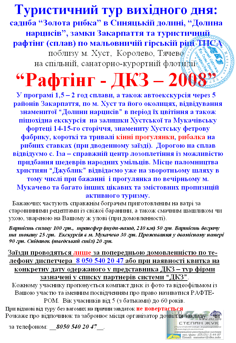 Маємо приємну нагоду повідомити Вас, як співучасника Інформаційно-Реєстраційної Системи "ДКЗ" (Диспетчер куротів Закарпаття) про продовження роботи одного із проектів від ДКЗ "ТУРИСТИЧНИЙ РАФТИНГ" або туристичний сплав по гірській Тисі у сезоні 2016 року.